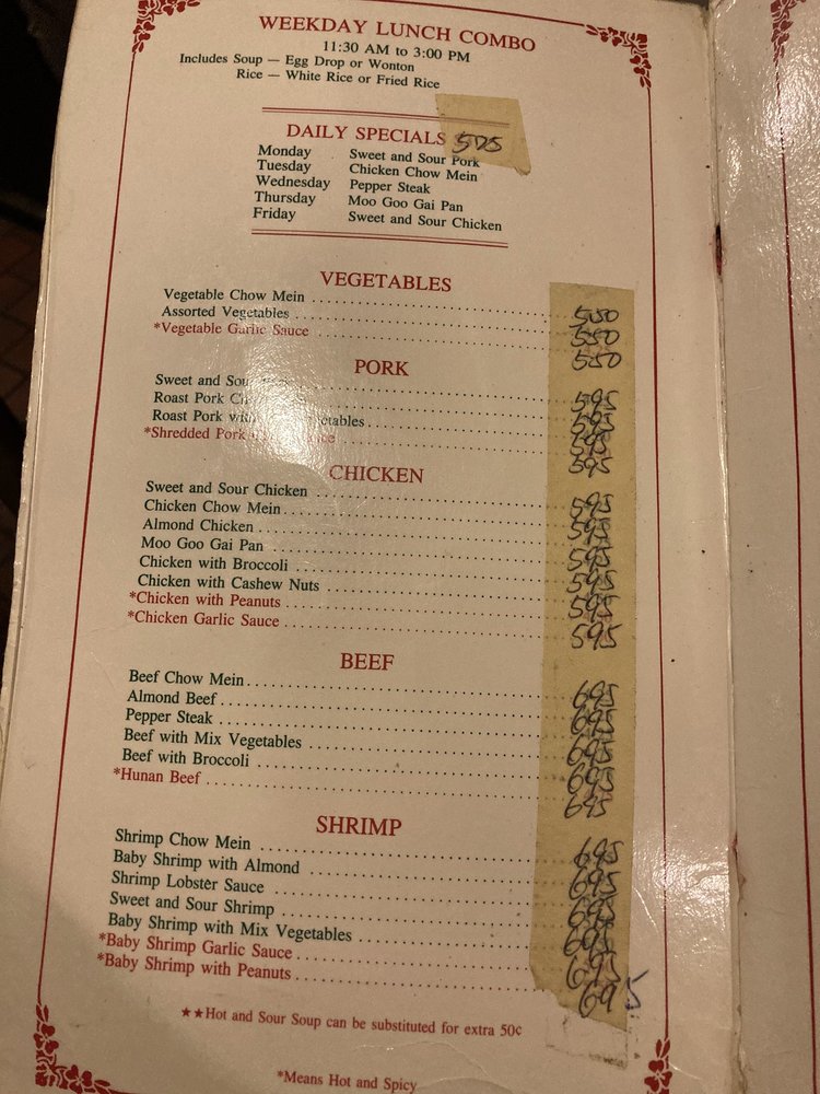 Start your meal with their comforting soups, such as Egg Drop Soup or the zesty Hot and Sour Soup. The highlight of the menu includes a range of poultry entrees like the classic Sweet and Sour Chicken and the crowd-favorite Chicken with Cashew Nuts, all at incredibly affordable prices.